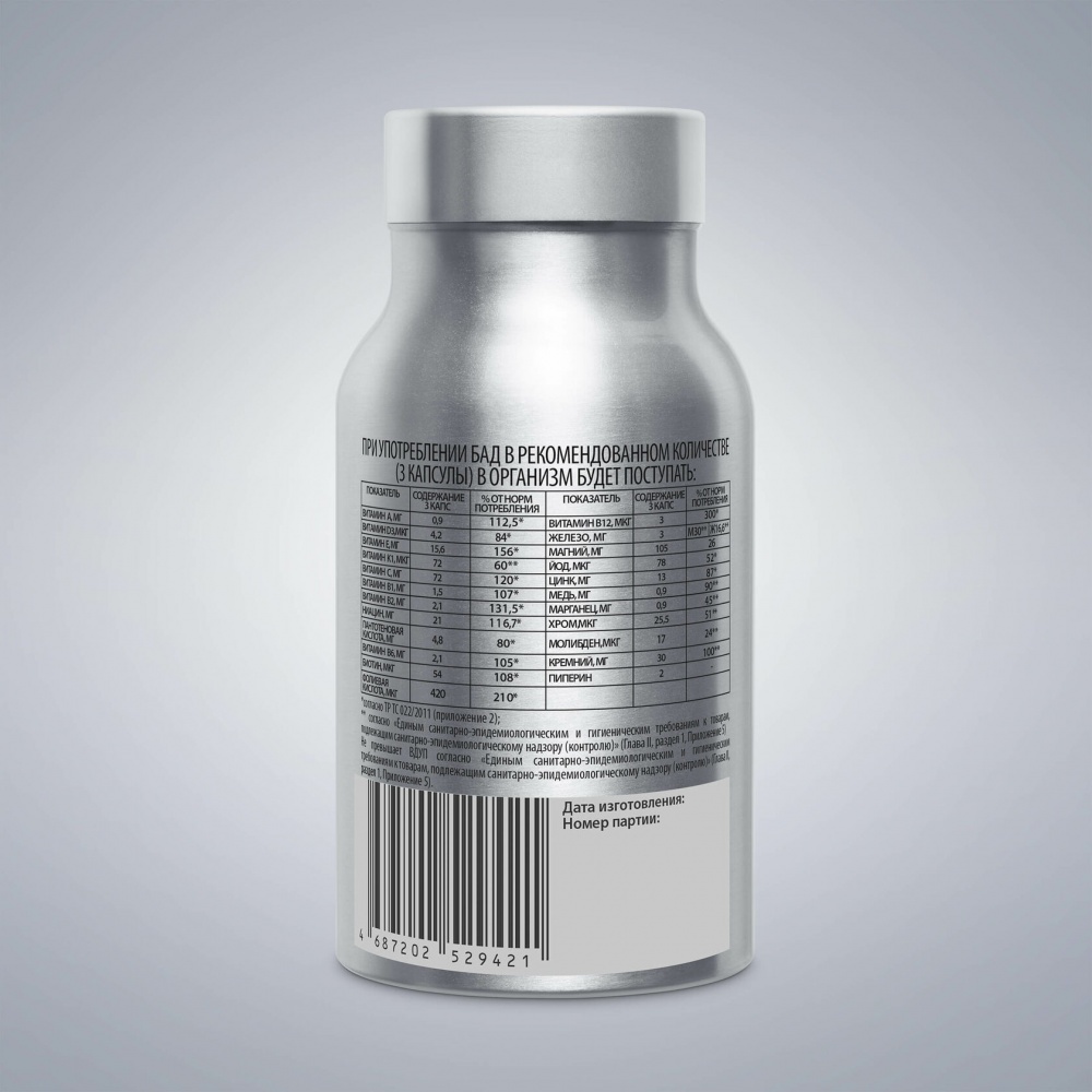 В основе средства лежит мультивитаминный комплек, содержащий 23 витамина, микро- и макроэлемента, необходимых для ежедневной жизнедеятельности: селен, медь, магний, витамины группы В, йод, железо, витамины Д3 и С и другие.