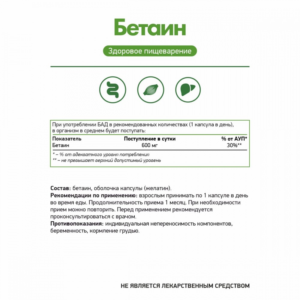 Бетаин способствует выработке глутатиона, который обладает мощным антиоксидантным действием. Бетаин обладает гепатопротекторным свойством, способствует выведению из организма токсических веществ, заживлению тканей, очищает сосуды, улучшает функции печени, благотворно воздействует на метаболизм в целом.