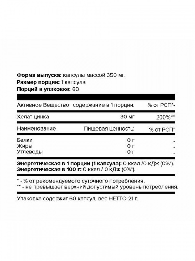 Состав: хелат цинка, микрокристаллическая целлюлоза, твердая капсула (желатин).