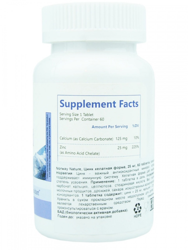 | Цинк (в форме хелата бисглицината цинка): | 25 мг |