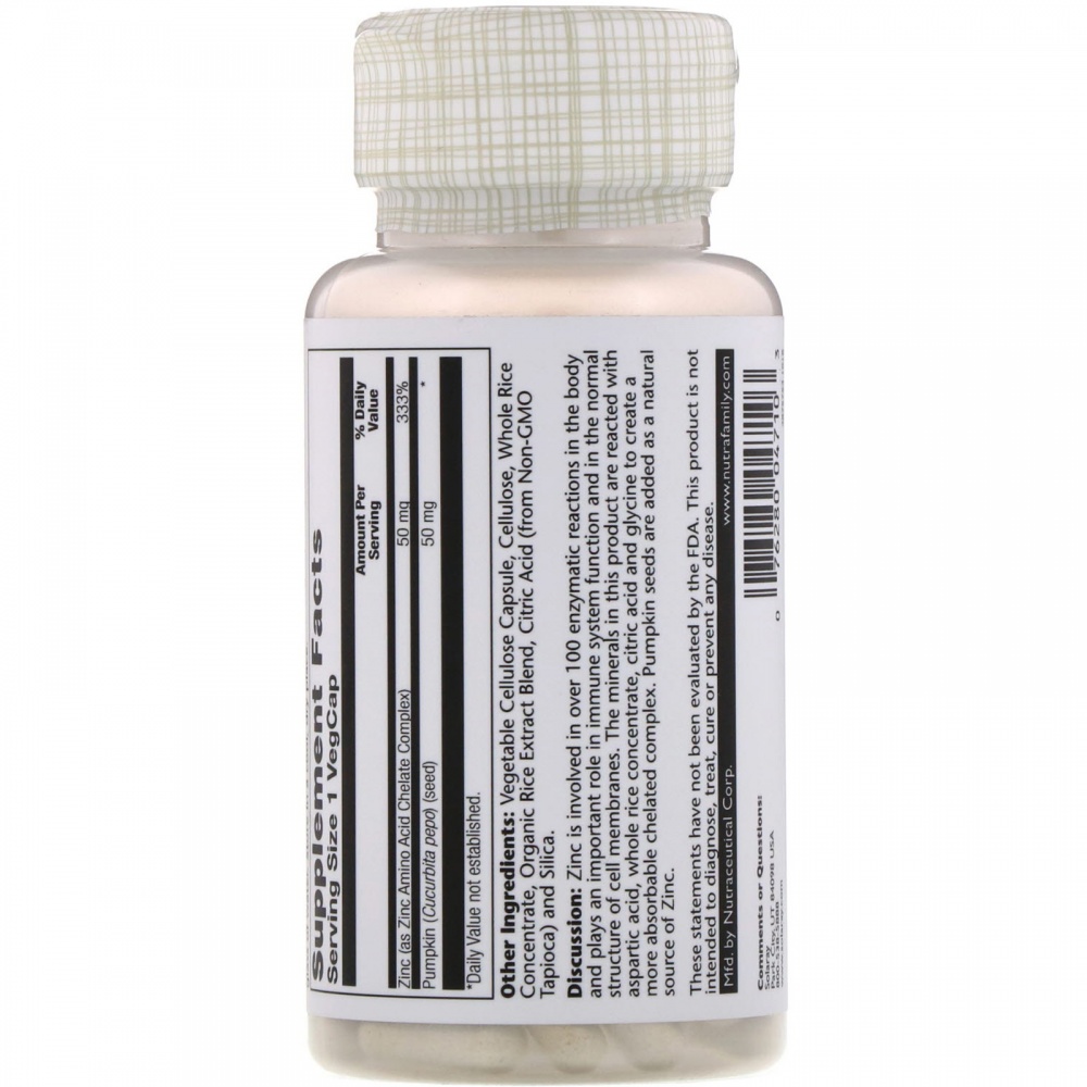 Цинк участвует в более чем 100 ферментативных реакциях в организме и играет важную роль в функционировании иммунной системы и в нормальной структуре клеточных мембран. В этом продукте минералы вступают в реакцию с аспарагиновой кислотой, концентратом из цельного риса, лимонной кислотой и глицином. В результате образуется хелатный комплекс с более высокой усвояемостью. Тыквенные семечки добавляются как естественный источник цинка.