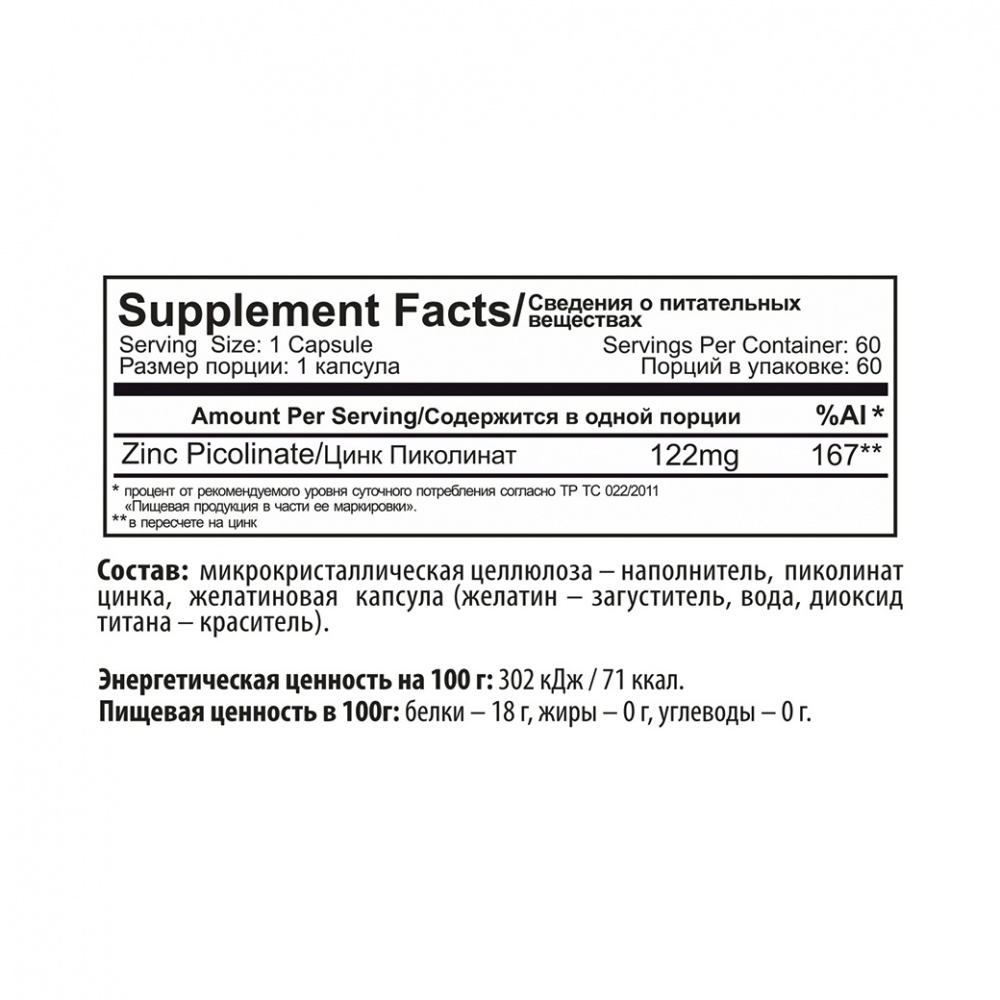 В одной капсуле Life Picolinate Zinc (122 мг) содержится 25 мг легкоусвояемого цинка. Физиологическая норма ежедневной потребности цинка для взрослого человека составляет 15 мг. Поэтому лайф пиколинат цинка полностью покрывает необходимую норму и намерено превышает ее в пределах безопасной нормы. В случае дефицита цинка в рационе, дозировку можно увеличить до 50-60 мг в сутки- это касается мужчин, беременных женщин, а также спортсменов. Курсовой прием повышенной дозировки также благоприятен для профилактики иммунитета в период иммунодефицита. А также для поддержания здоровья половой системы.